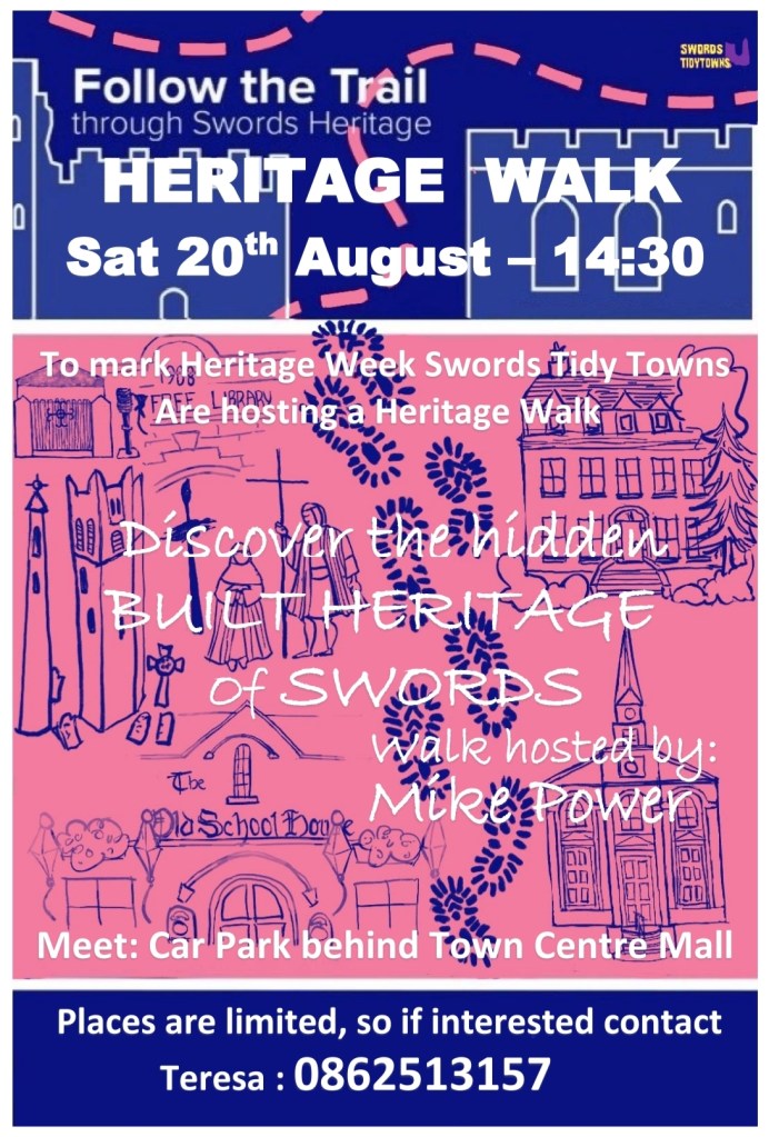 To mark Heritage Week 2022, Swords Tidy Towns are hosting a heritage walk “Discover the hidden built heritage of Swords”. This walk is kindly hosted by Mike Power. This is a free even, but places are limited so book early to avoid disappointment.