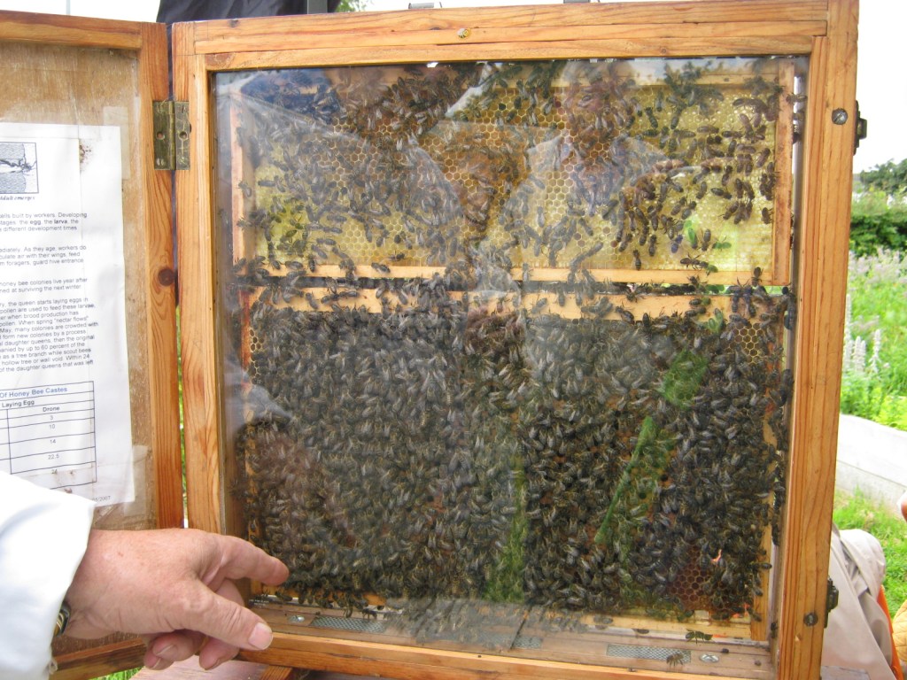 Michael used a glassed in section from one of his hives to show us the workings of an actual hive. We could see the hexagonal cells filled with honey or with brood.