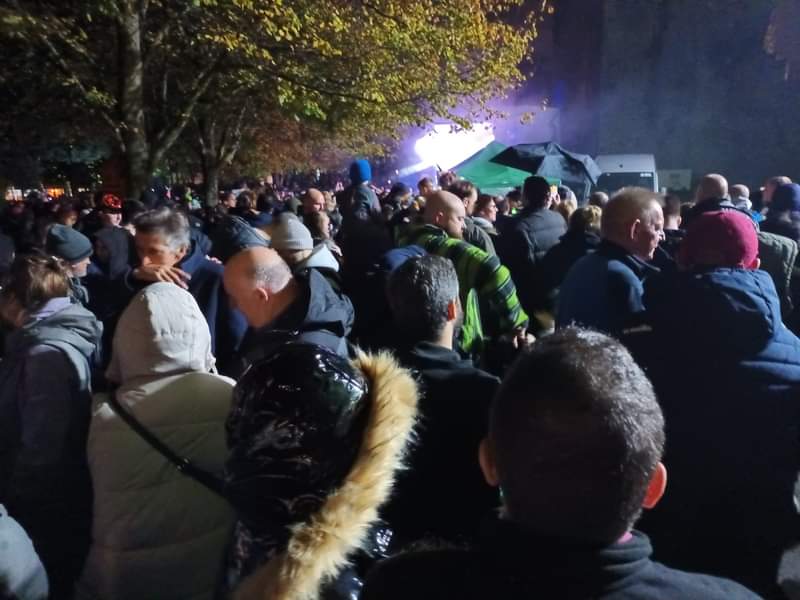 Families and other groups, many in Halloween disguises, packed around the stage, enjoying the live performances.
