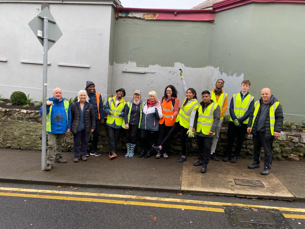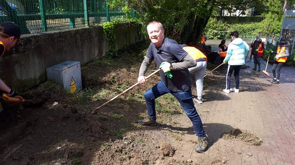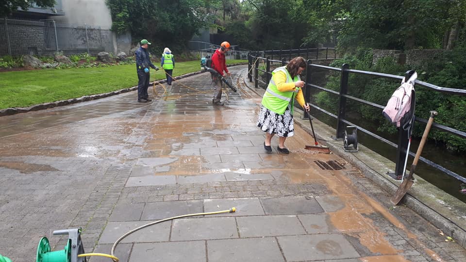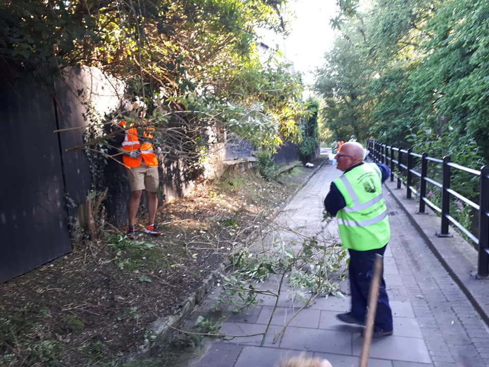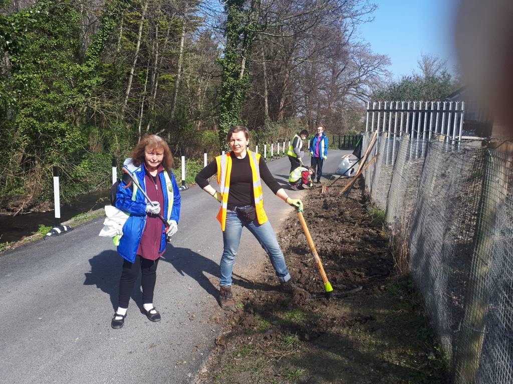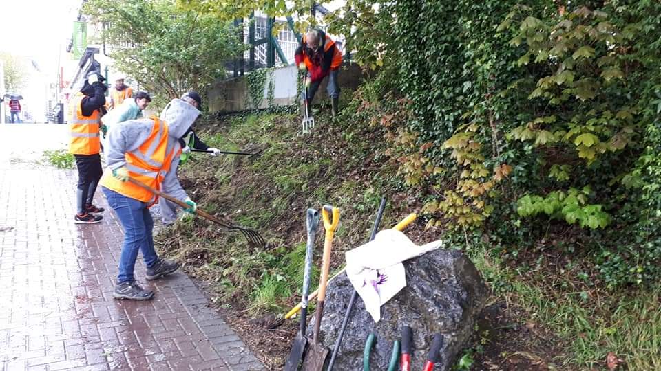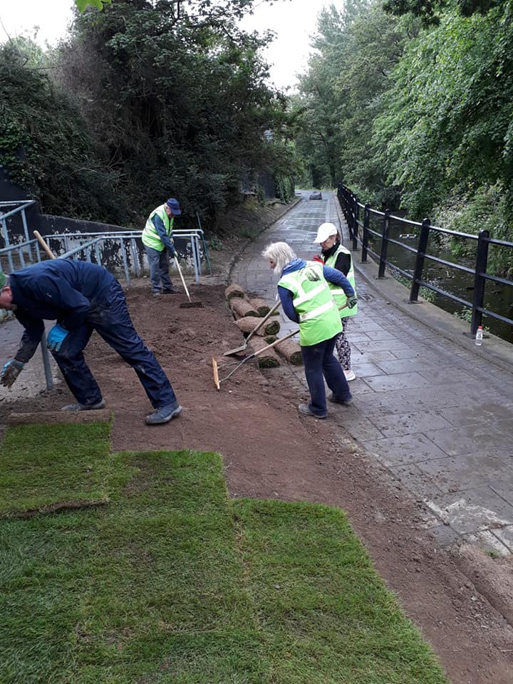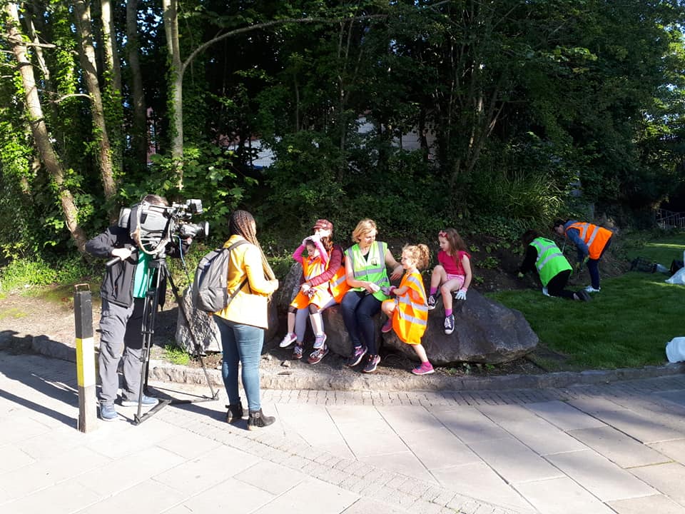 Step 3 – Expanding the area: clearing the undergrowth on the riverbank, painting the wall and removing graffiti – all while being visited by RTÉ Nationwide.