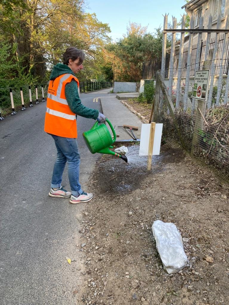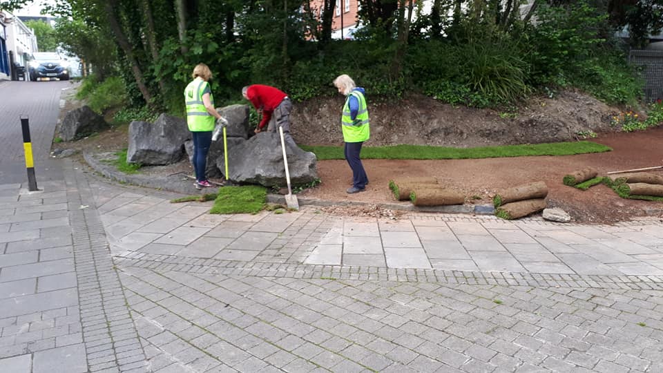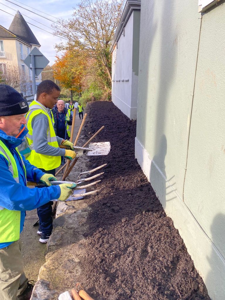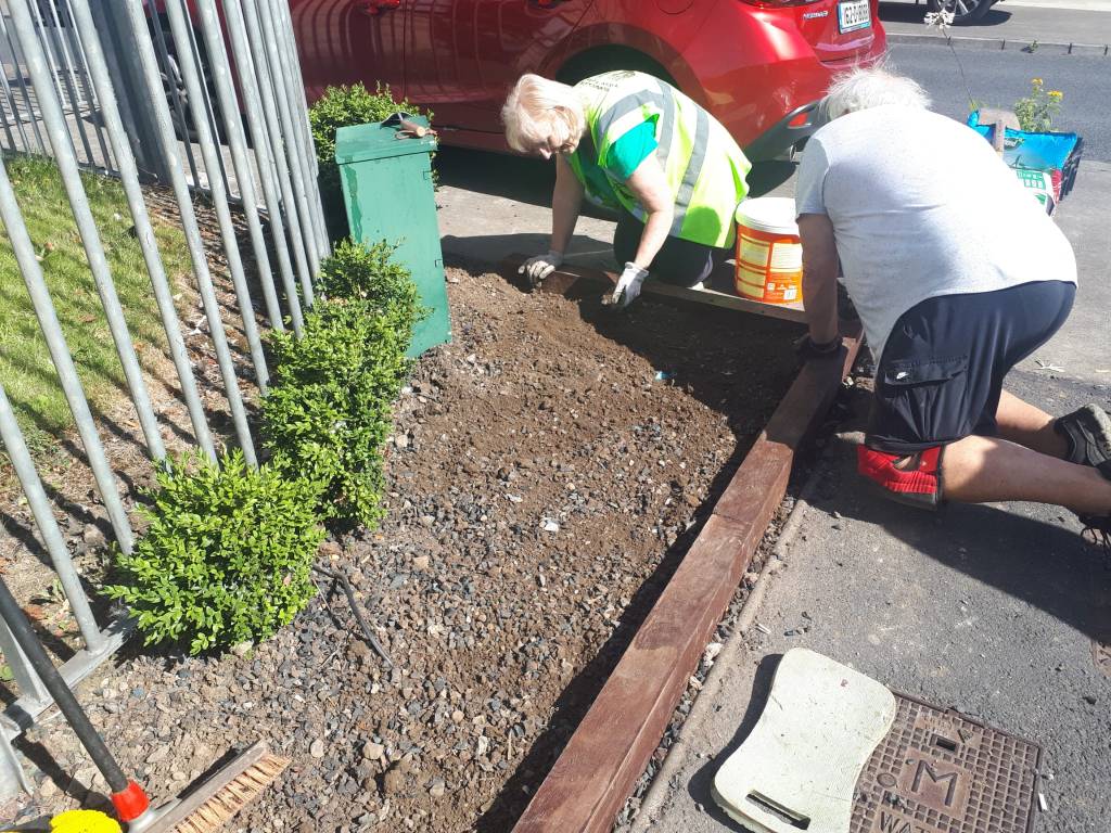 Preparation of the ground was challenging and required hours of tough digging by STT member Mary Maxwell and her hardy crew of volunteers. Mary has been heavily involved in the design and execution of our gardening projects around the town for some years. It’s great to have her expertise.