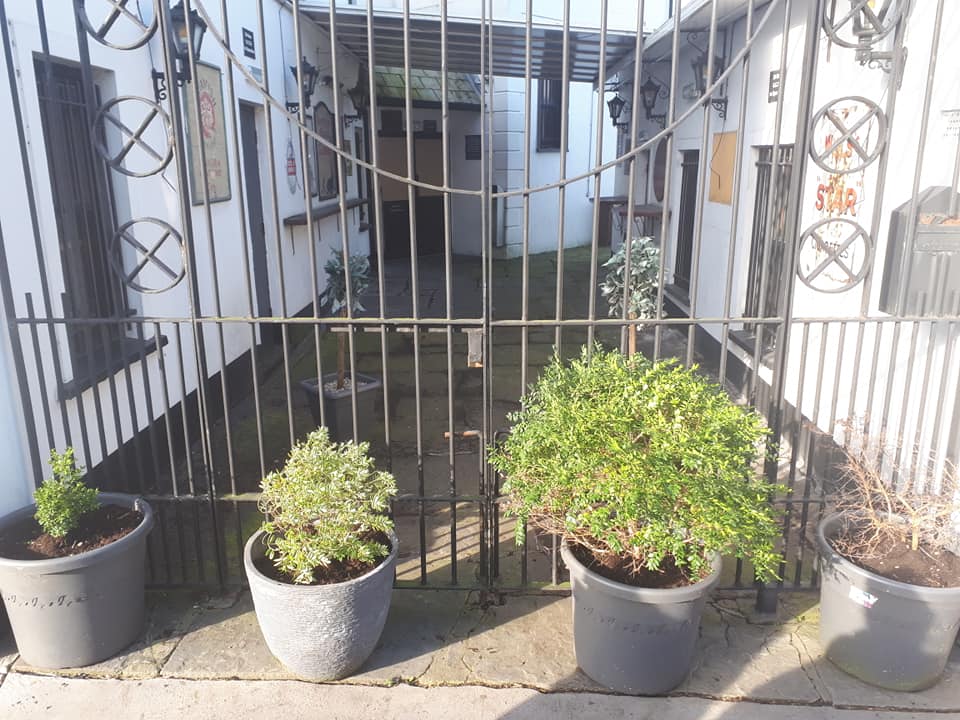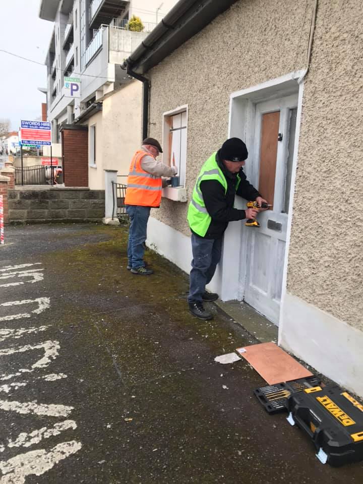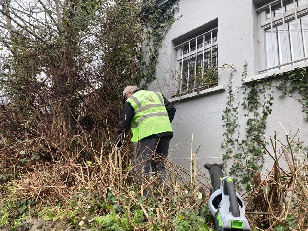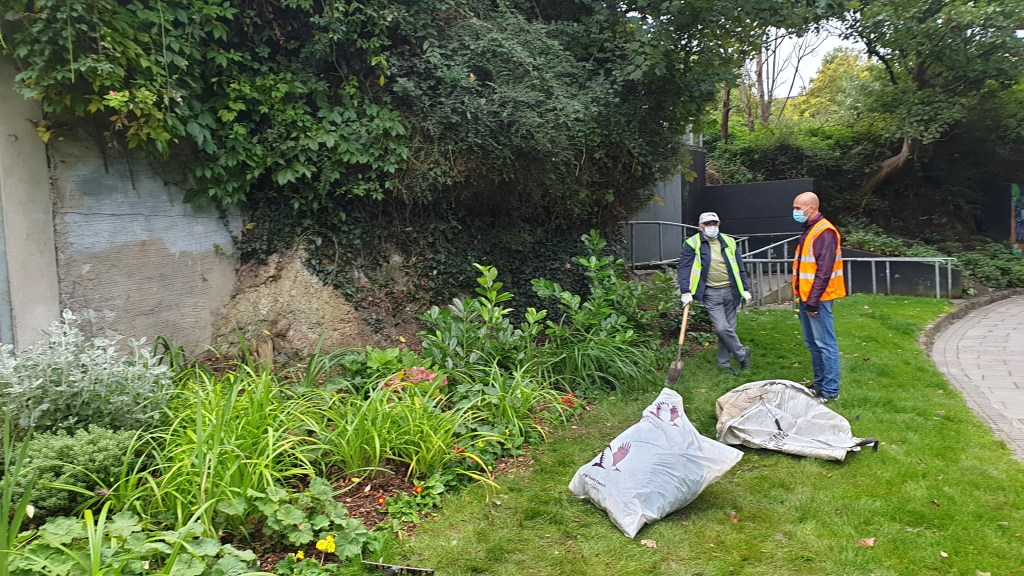 Swords Tidy Towns have been concerned about the detariorating state of the recently closed down Lord Mayor’s Pub and a little cottage across the road from it. The permission was given to access the premises of Lord Mayor’s so the entranceway visible from the Main street can be tidied up. Seven of our volunteers spent a couple of hours sweeping the leaves and debris, and rescuing forgotten plants.