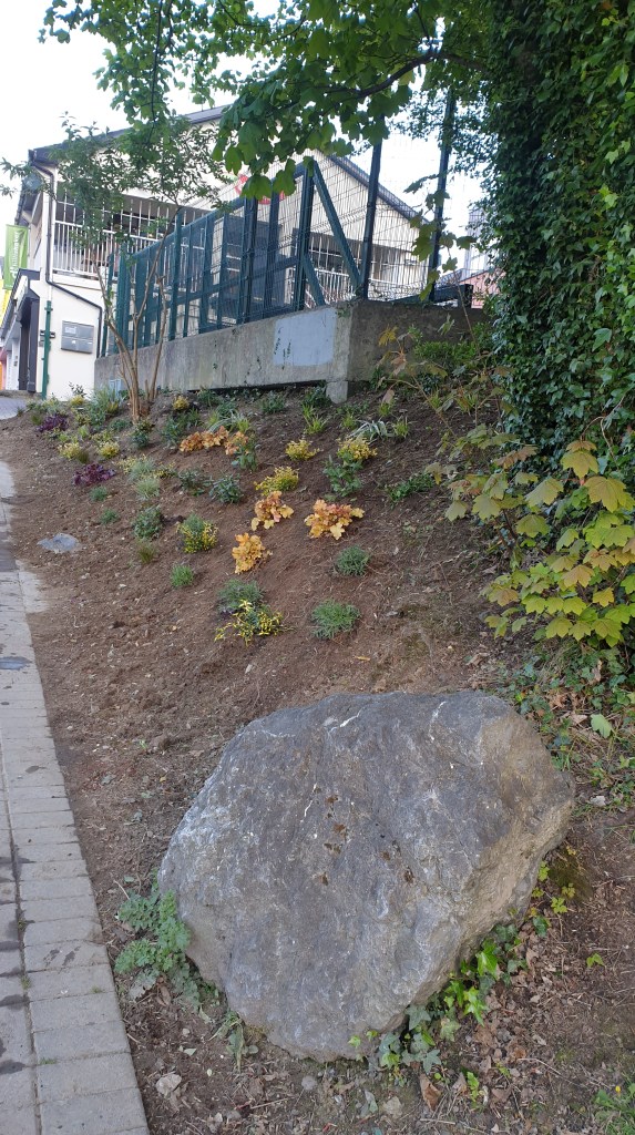 As a final step we have also improved the look of the flowerbed on the other side of the entrance to the school. We have extended the planting area, added a protective border and planted some more pollinator-friendly flowers.