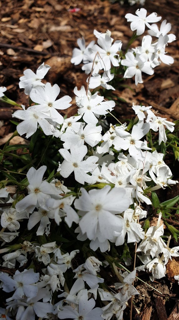 Mary and Gerry planted geraniums and spread mulch along the area where the grass had been removed.