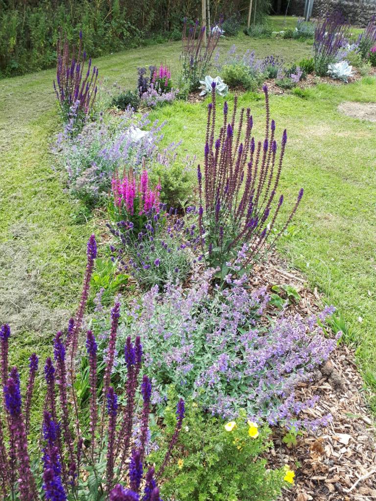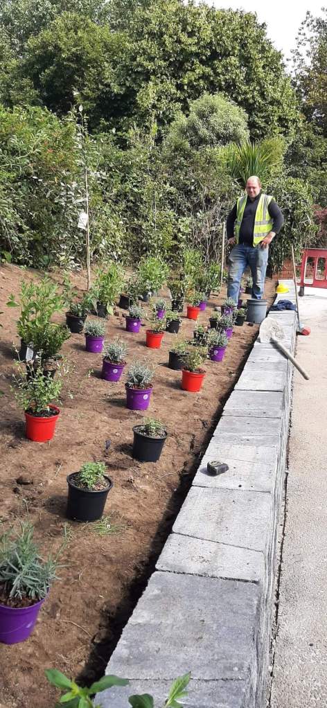 Creating the flower bed allowed us to rejuvenate an area that was neglected for a very long time. We planted plants that will provide colour and interest all year round. We planted some evergreen plants, shrubs and lots of perennial pollinators friendly flowers like Salvia, Calluna Vulgaris, Rudbeckia, Erigeron, Lavender, Echinacea, Aster, Hebe and many others.