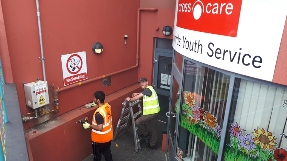 The sleepers were installed under the watchful eyes of Matt Cullen, Mary Maxwell and Billy McClean. They were also involved in the painting. The staff at Colourtrend advised on the correct stain for the sleepers. Lindsey Balfe, a teacher at St Finians Community College, cut out all the letters and made the logos.