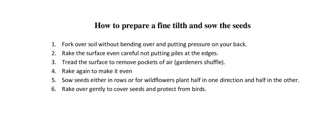 - Soil preparation for wildflowers meadow: remove the turf – clear the weeds – leave for 3-4 weeks – sow the seeds (stale bed)