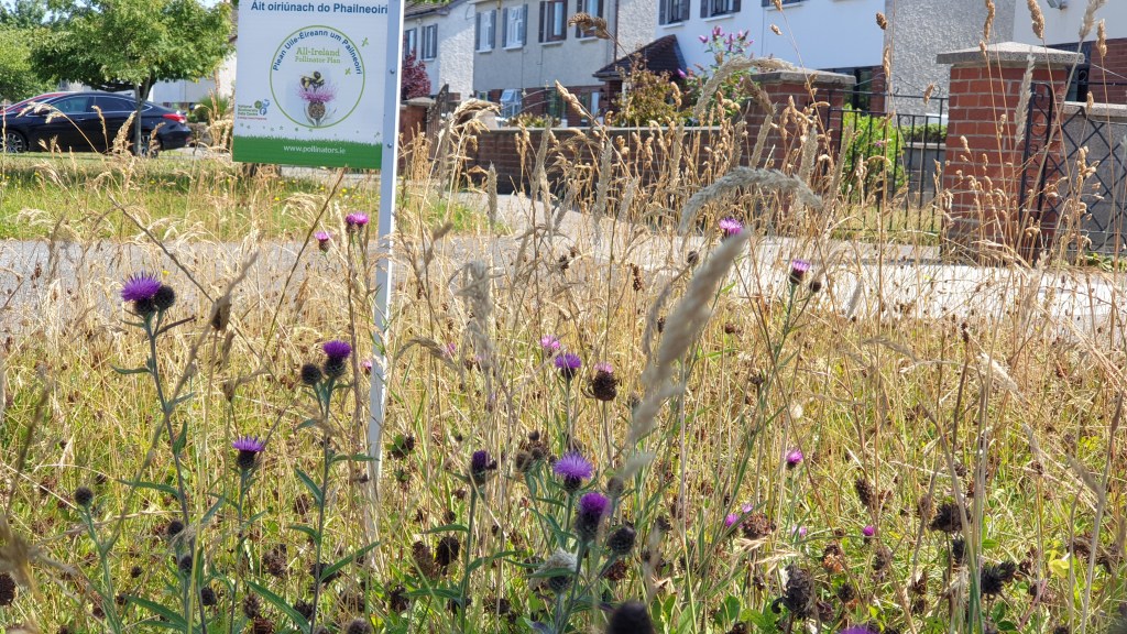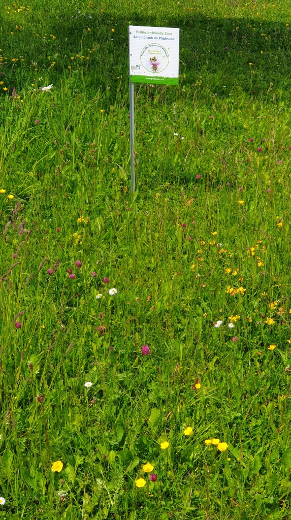 One of our volunteers has dedicated the green area outside her house for the pollinators. She has reduced the mowing regime to once a year, have some pollinators friendly spring bulbs planted and All-Ireland-Pollinator sign installed. The area is located just in front of the local primary school and proves to be very popular and educational with the pupils of the school. A photo gallery below shows some of the different stages of the meadow throughout the year.
